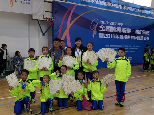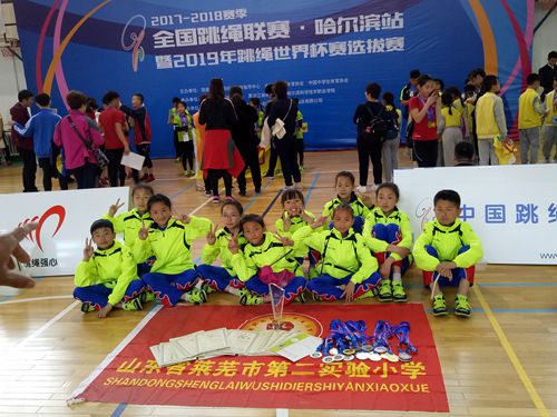 4月20—23日,我市第二实验小学跳绳代表队参加了2018年全国跳绳联赛哈尔滨站暨2019年世界杯预选赛的比赛,取得了20枚金牌,12枚银牌,6枚铜牌,2个团体第一名,2个团体第二名的好成绩。本次比赛由国家体育总局、中国大学生体协、中国中学生体协举办,共有来自全国的33支代表队参加了62个项目的比赛。 莱芜市第二实验小学在2017年被国家体育总局命名为 “全国跳绳传统项目示范学校”“全国跳绳大课间示范学校”并在2017年全国跳绳大课间比赛中获得二等奖。学校坚持开展跳绳运动,并研发校本课程,编印了《绳舞飞扬》校本教材,建构了“五彩段位晋级”制的跳绳教学内容体系,每年,体育季,学校通过“跳绳节”、“跳绳挑战擂台赛”、“ 跳长绳班级赛”、“ 花样跳绳创编赛”等各种活动,加强学生跳绳训练,形成了“以绳健体、以绳增智、以绳育人”的学校特色。跳绳运动的开展不仅让学生身体素质得到提高,还培养了强烈的团队意识及合作意识。(基础教育科 ?巩振国) ?